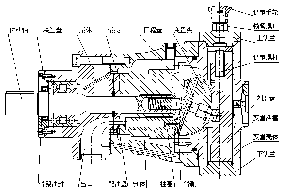 手動(dòng)變量泵改變流量靠外力轉(zhuǎn)動(dòng)調(diào)節(jié)手輪,旋轉(zhuǎn)調(diào)節(jié)螺桿,帶動(dòng)變量活塞沿軸向移動(dòng),同時(shí)帶動(dòng)變量頭繞中心轉(zhuǎn)動(dòng),改變傾斜角,達(dá)到變量目的。當(dāng)達(dá)到所需流量時(shí)可使鎖緊螺母緊固。